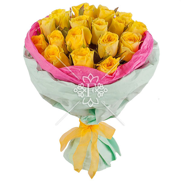 роза жёлтая - 15 шт., упаковка, лента.